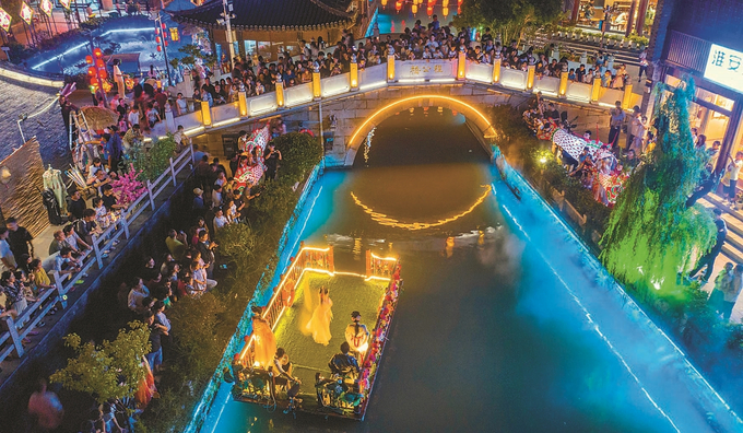 9月16日晚,游客在淮安河下古镇观赏花船表演《月映霓裳》。 朱天羽 摄 (视觉江苏网供图)