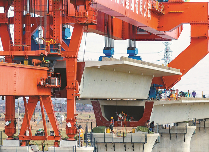 12月29日,在淮安市洪泽区的宁淮城际铁路施工现场,工人开动架梁机,将预制箱梁安放在墩柱上。目前,宁淮城际铁路淮安段全线正加紧开展箱梁架设工作,整体工程建设稳步推进。 贺敬华 摄 (视觉江苏网供图)