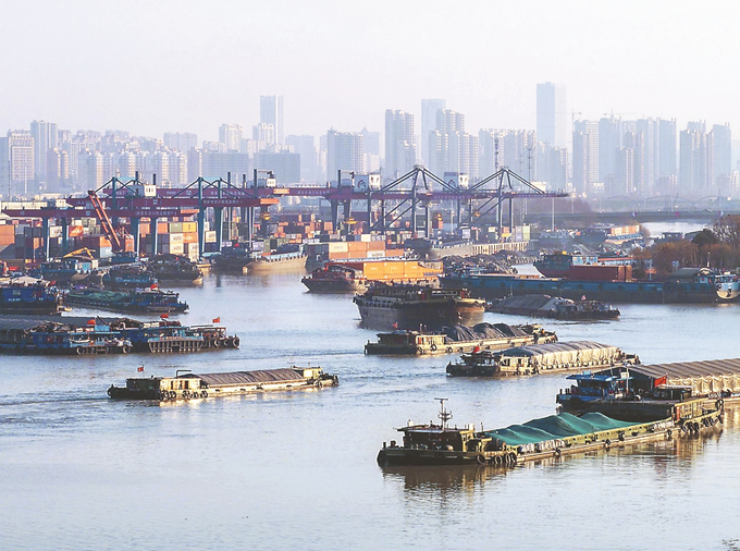 1月2日,京杭运河江苏省交通运输厅苏北航务管理处公布最新数据,2024年,苏北运河十个梯级船闸累计开放闸次30.4万次,货物运量3.27亿吨,连续11年突破3亿吨大关。其中,运输集装箱73.2万标准箱,同比增长25%,持续迸发黄金水道综合效益。图为1月1日,京杭大运河淮安段,装载货物的船舶有序航行,一派繁忙。 贺敬华 摄 (视觉江苏网供图)