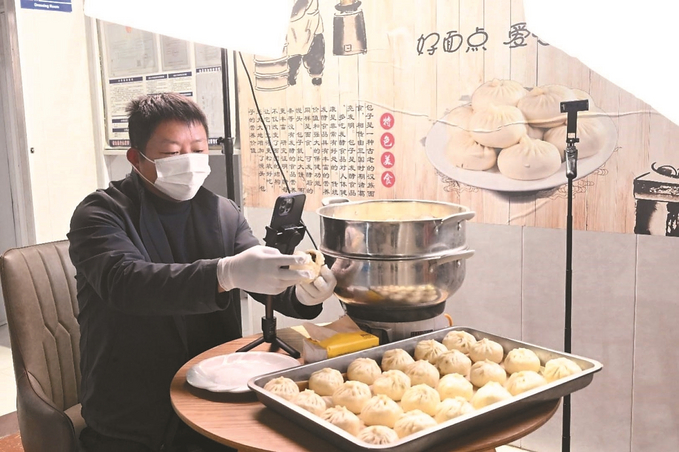 过年吃包子,来年日子“蒸蒸日上”。新春将至,盱眙县黄花塘镇年销包子近百万只的百年包子铺订单火爆,该店包子品种多达15个,每位师傅平均每天要捏出1500只包子。图为1月14日,该店师傅在直播销售包子。