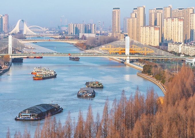 开春以来,为保障运河沿线企业生产、农村春耕和人民生活物资供应,京杭大运河呈现一派繁忙景象。图为船舶在京杭大运河淮安段航道上穿梭。 贺敬华 摄 (视觉江苏网供图)