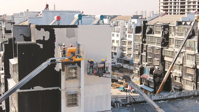 12月8日,在涟水县涟城街道水岸城邦老旧小区改造中,工人正对墙面进行抗裂砂浆批涂刷白作业,彻底解决墙皮脱落、墙面渗水安全隐患,让居民生活安心舒心。 王东 摄 (视觉江苏网供图)