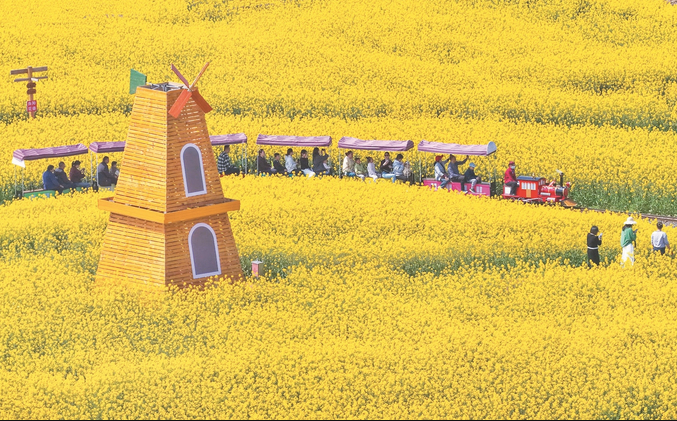 4月4日,游客在盱眙县黄花塘村向阳花海里乘坐观光小火车赏春日美景,乐享假日美好时光。本报记者 余萍 摄