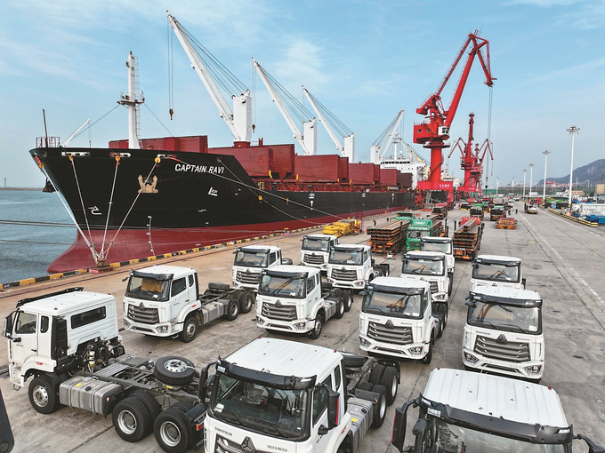 四月七日,在连云港港东方港务分公司码头,一千五百多台“中国制造”工程机械车、大巴车、摆渡车等正被有序装船,准备驶往中东、非洲、东南亚等共建“一带一路”国家。 王春 摄 (视觉江苏网供图)