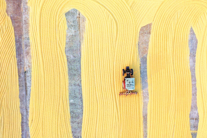 10月27日,连云港市海州区的江苏农垦岗埠农场,职工驾驶粮食翻晒机械在场上来回穿梭,翻晒刚刚收获的水稻。 陶桂军 严连凤 摄(视觉江苏网供图)
