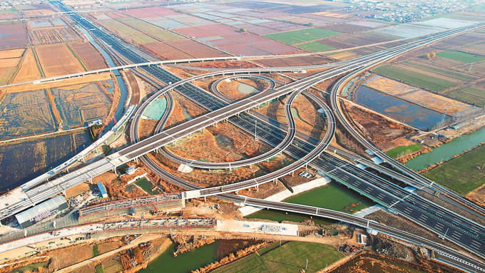 12月9日航拍正在有序推进的连宿高速公路灌云县小伊枢纽工程。连宿高速公路二期工程项目起自连宿高速小伊枢纽,线路全长约49公里,全线采用双向四车道高速公路标准建设,设计时速120公里。 耿玉和 摄 (视觉江苏网供图)