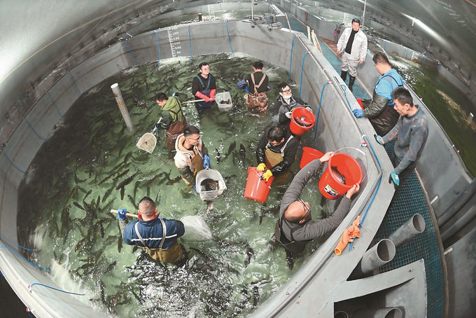 12月22日,在江苏连深海洋科技有限公司三文鱼苗种基地,工作人员将2万余尾三文鱼从育苗池捞出装车,准备运往连深海洋三文鱼养殖工船“苏海1号”。这标志着赣榆深远海养殖迈入“海上智慧牧场”时代。 朱泓明 姜文 摄(视觉江苏网供图)