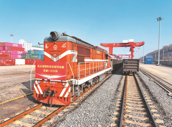 1月16日,中欧(亚)班列在中哈(连云港)物流合作基地准备发车。当日,一列满载日用品、汽车零配件的国际货运班列从中哈(连云港)物流合作基地鸣笛启程,经霍尔果斯口岸出境后,将货物分拨至哈萨克斯坦、乌兹别克斯坦等国家。至此,连云港国际货运班列累计开行量达1.75万列,完成货运量143.5万标箱。 王春 佃好 摄 (视觉江苏网供图)