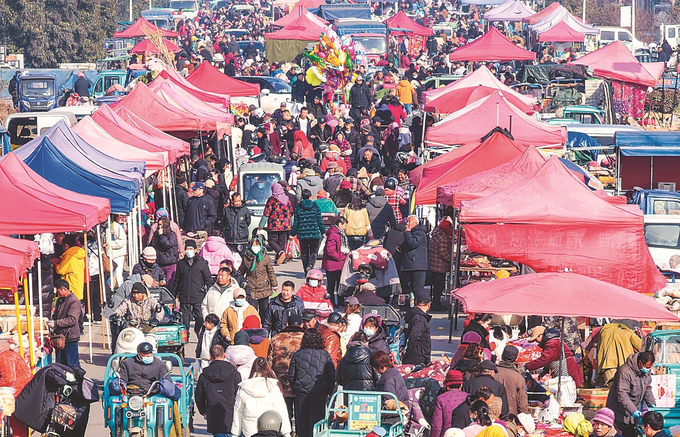 2月2日,连云港市赣榆区墩尚镇乡村大集上,非遗表演热闹非凡。图为人们在大集上选购年货。 王健民 摄(视觉江苏网供图)