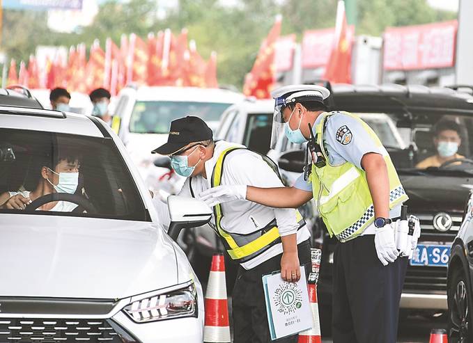 G36宁洛高速曹庄出入口是连接江苏南京与安徽滁州的重要通道,曹庄收费站查验点是南京市首批设置的疫情防控“离宁查验点”之一。自7月25日起,南京市公安局交警支队高速八大队民警,协同交通部门、属地政府,迅速投入查验工作,坚决阻断疫情传播链。图为8日,民警在收费站查验点对离宁车辆进行安全检查。 通讯员 叶建华 本报记者 乐涛 摄