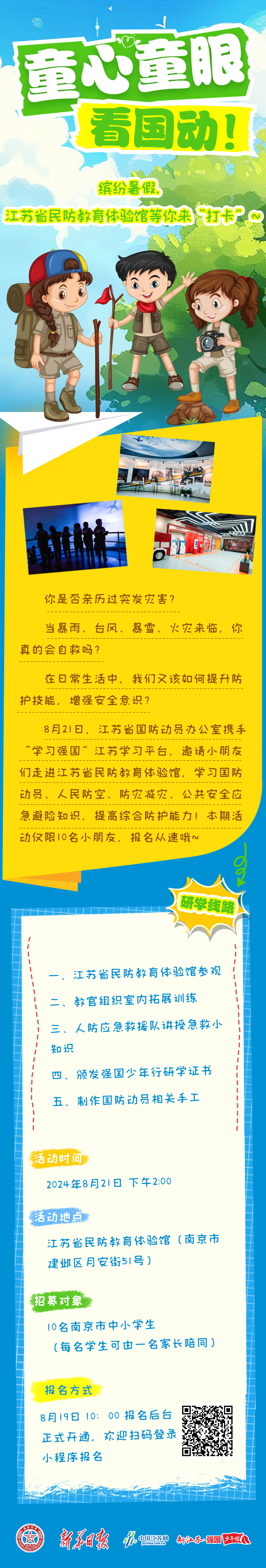 云天收夏色,木叶动秋声。时隔半月,在学生、家长们的期待中,第二期“强国少年行·童心童眼看国动”研学活动即将启动,也为缤纷暑假画上圆满句号:8月21日下午2点,让我们相约江苏省民防教育体验馆,一起开启精彩的研学之旅吧。