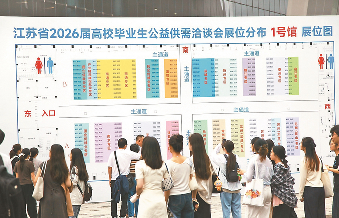 9月27日,江苏省2026届高校毕业生公益供需洽谈会上,毕业生在查看用人单位展位分布。 刘建华 摄 (视觉江苏网供图)