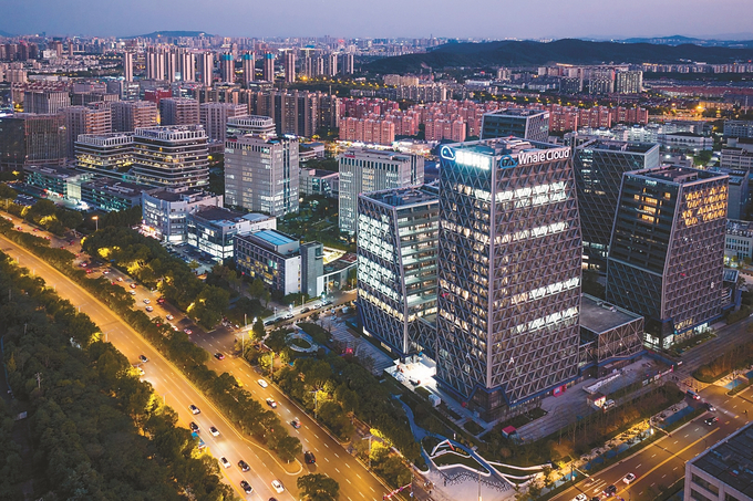 位于中国(南京)软件谷的南京人工智能生态街区街巷更新一、二期工程基本完工。工程系统打造了精神堡垒、主题雕塑等一系列特色元素,在美化街区环境的同时,将南京人工智能生态街区塑造为“未来生活体验街区”。图为10月22日,俯瞰晚霞映衬下的南京软件谷。 本报记者 万程鹏 摄