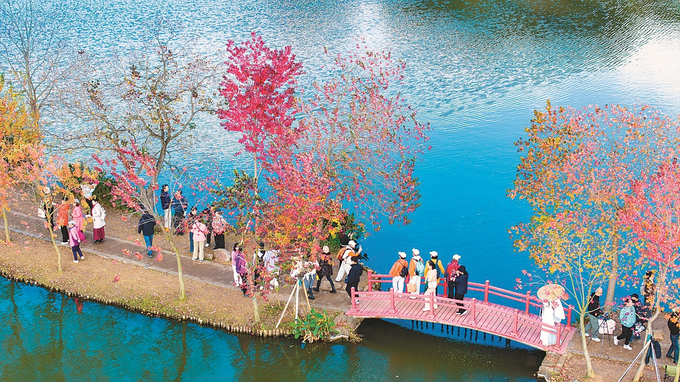11月11日,南京紫金山前湖,湖面如镜,秋叶如诗,公园里的步行道两旁,五颜六色的秋叶摇曳生姿,让人流连忘返。 老木子 摄 (视觉江苏网供图)