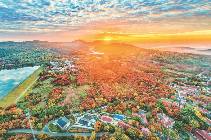 11月13日,霞光映照的南京市溧水区白马镇浮山村色彩斑斓,山峦与水库、村落、林木、田园相映成景,构成一幅生态宜居的美丽画卷。 朱红生 摄 (视觉江苏网供图)