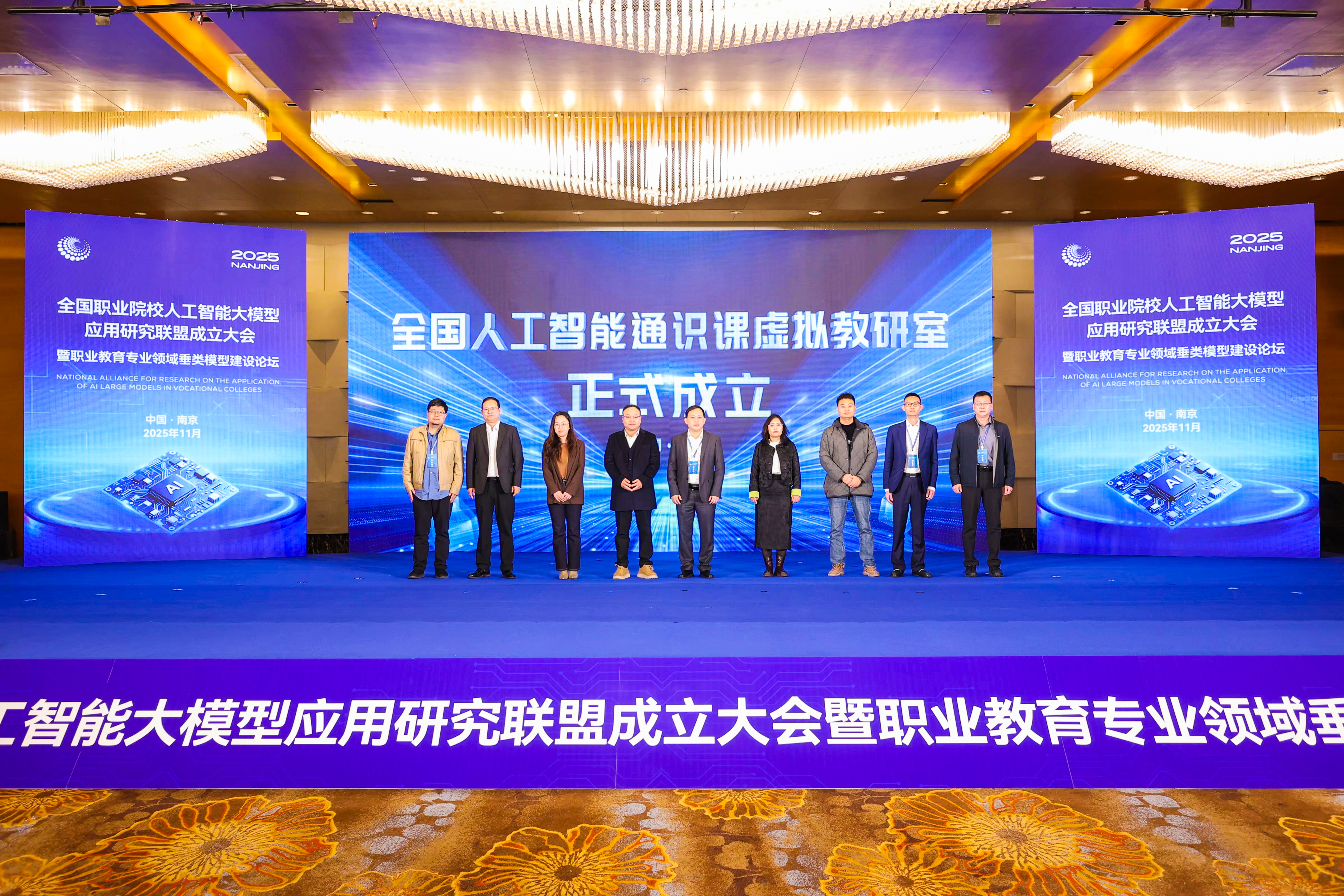 现场,全国人工智能通识课虚拟教研室成立。南京信息职业技术学院副校长杜庆波则聚焦人才培养实践,认为融合的关键一方面要推动专业转型升级,将AI技能融入教学内容;另一方面要用AI技术服务教学过程,实现个性化、智能化教学。现场成立的虚拟教研室正是重要载体,可利用东部优质资源助力西部院校AI通识课师资培养。该校人工智能学院院长何淼补充道,未来各专业将形成“大模型+专业知识库+算力底座”的数字化支撑,催生智慧学伴、AR助教等数字课堂新应用,需联盟各方联合探索路径与标准。