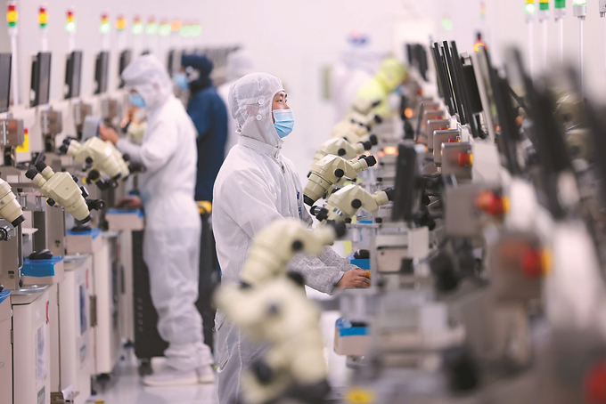 12月9日,位于南京市的江苏长晶浦联功率半导体有限公司工人在加紧生产半导体封测产品。当前,该公司正开足马力,加紧赶制生产订单,奋力冲刺四季度,实现全年生产目标。截至目前,公司今年封测产品产量已突破100亿只。 本报记者 陈俨 摄