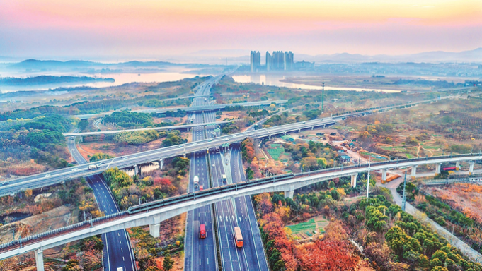 12月10日,晨曦下的南京市溧水区桂庄枢纽色彩斑斓,川流不息的车辆与立体交通生态景观构成一幅流动的美丽画卷。 朱红生 摄(视觉江苏网供图)