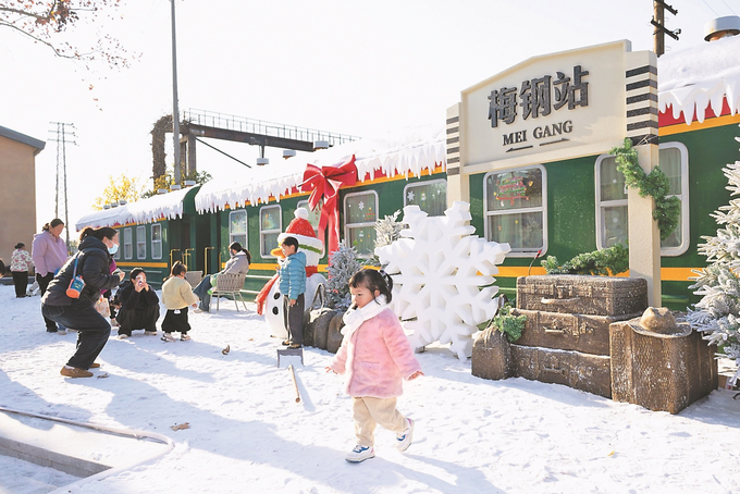 12月25日,梅钢工业文化旅游区推出“梅钢号”绿皮火车观光和雪景打卡活动。游客可乘坐仿古式浪漫雪景绿皮列车,沿途欣赏工业文明景观与长江自然风光,体验工业与生态融合的独特魅力。 本报记者 蒋文超 摄