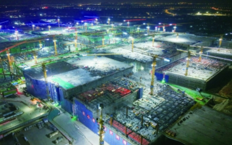 安装在高处的探照灯光线刺眼,塔吊上加装的荧光灯条也格外醒目,站在南京北站枢纽工程建设现场,宛如置身于一条“钢铁巨龙”之中。“南京北站站房建设标准很高,最主要就是体现在钢结构含量高,同时混凝土体量大,这些都让这项超级工程更加坚固。”该负责人说。