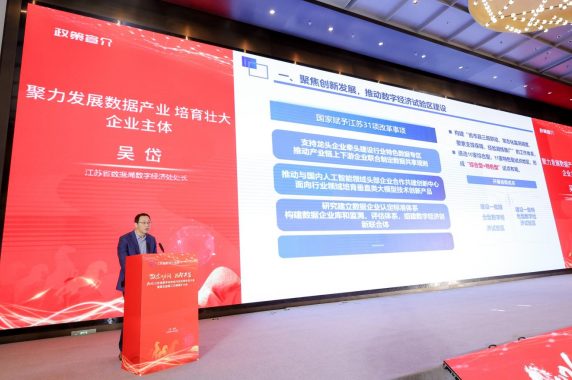 政策是江苏数智化发展的“风向标”,本次大会设置的政策解读环节为我省数智化发展精准导航。省数据局数字经济处处长吴岱解读《聚力发展数据产业培育壮大企业主体》,明确数据采集、存储、交易等全产业链培育路径,提出“龙头引领、中小企业协同”的产业发展模式;