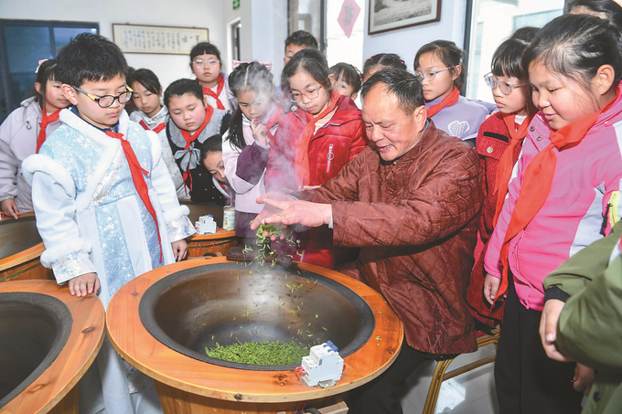 南京市溧水区晶桥镇芮家社区马村盛峰雨花茶基地,国家级非遗代表性传承人陈盛峰近日为晶桥镇中心小学的学生们展示茶叶摊青、杀青、揉捻、烘干等传统制茶工序。学生们在沉浸式体验中不仅增长了见识,更深刻体会到劳动的艰辛与收获的喜悦。 本报记者 邵丹 摄