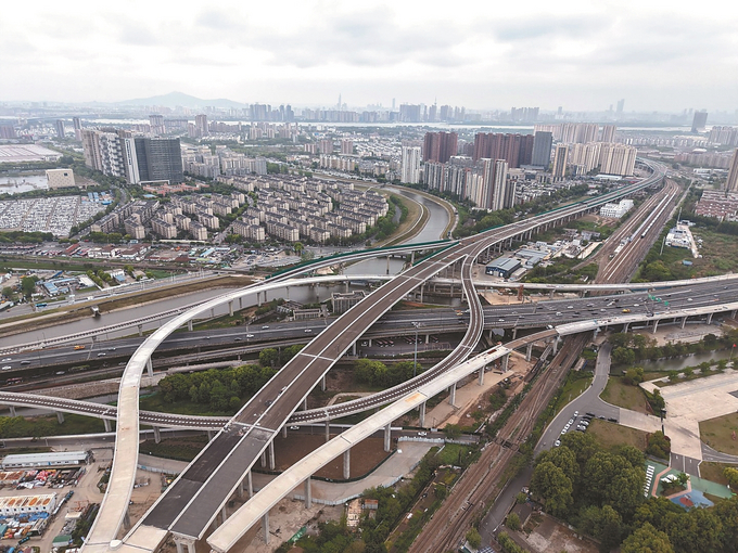 4月20日,航拍南京建宁西路过江通道江北段涉铁1标段,四座匝道桥主体全部建成。目前,项目主线隧道、江北段、江南段已同步进入收尾阶段。 本报记者 宋宁 摄