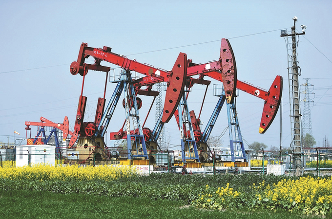 三月二十四日,在海安市胡集街道钟涵村的浙江油田苏北采油厂管理区内,抽油机、钻井井架与油菜花、麦田等组成了一幅五彩斑斓的春日美景图。顾华夏 摄 (视觉江苏网供图)