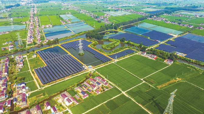 海安市坚持生态优先、绿色发展,依托里下河水乡丰富的水域资源,大力发展“渔光互补”光伏产业,将清洁能源生产与水产养殖有机融合,形成“水上发电、水下养殖”的生态美景。图为8月20日,无人机航拍的该市里下河水乡的一座“渔光互补”光伏电站。 翟慧勇 摄 (视觉江苏网供图)