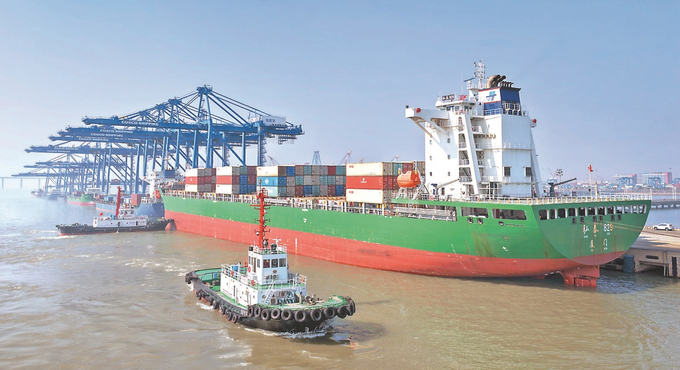 2月13日,随着“弘泰 829”轮在南通港通海集装箱码头靠泊,港口迎来开港以来最大载重吨船舶。该船长199.68米,最大载重58180吨,这也是该港口单船集装箱装载量首次突破1000箱。 许丛军 摄 (视觉江苏网供图)
