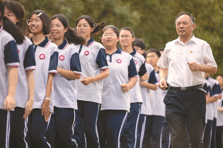 周桂官,一位75岁的校长,江苏“时代楷模”,他53年如一日,爱岗敬业、潜心育人。近14年,他退而不休,从如东到沭阳创办优质高中,甘当教育“燃灯者”,用爱点亮每一位学生的梦想。图为9月9日,周桂官和学生们一起跑操。本报记者 陈俨 摄