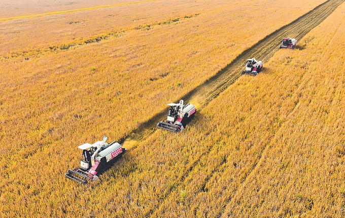 10月14日,泗洪县龙集镇4万亩优质水稻开镰收割。为确保收割质量,加快收割进度,当地政府组织助农服务队帮助农户抢收水稻,农户抓住晴好天气及时晾晒,确保颗粒归仓。 张连华 摄(视觉江苏网供图)