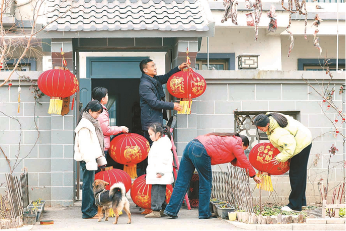 泗洪县通过政策撬动、以旧换新、新址新建等多项举措,因地制宜地建设宜居宜业和美乡村,稳步改善农民居住条件。图为1月23日,泗洪县瑶沟乡胡三村村民在新建农房挂灯笼迎新年。 许昌亮 摄 (视觉江苏网供图)