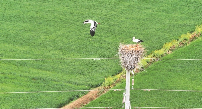 4月12日,泗洪县上塘镇,一对国家一级保护动物东方白鹳于电线杆塔上守护4只幼鸟,成为当地生态环境持续改善的生动例证。
