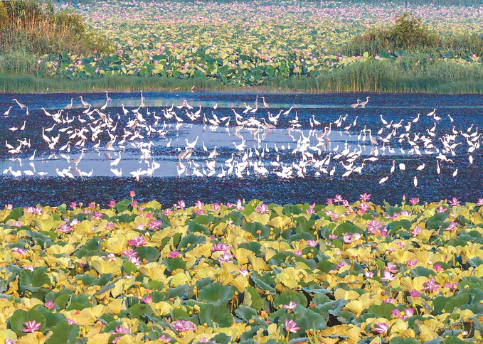 8月4日,泗洪县洪泽湖湿地临淮段,万顷荷花绽放,大批白鹭在此栖息觅食,构成一幅人与自然和谐共生的美好画卷。近年来,当地通过退渔还湿、智慧监测等生态修复措施,累计恢复湿地近30万亩,鸟类种群从147种增至240种。 张连华 摄(视觉江苏网供图)