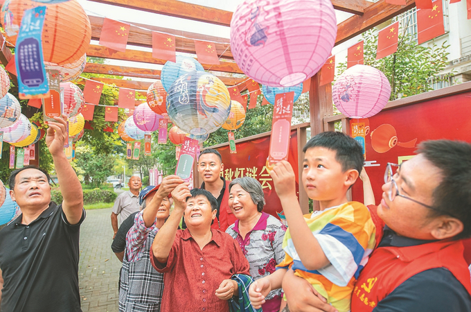10月5日,宿迁经开区三棵树街道幸福之家小区开展“老少同乐 共迎中秋”主题活动,老人小孩组队开展投壶小游戏、赏灯猜灯谜等,在欢声笑语中迎接中秋佳节的到来。 徐江海 摄 (视觉江苏网供图)
