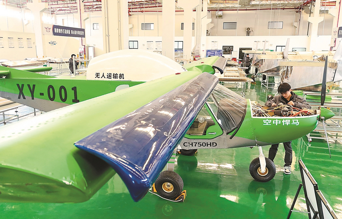 11月11日,位于宿迁市苏州宿迁工业园区的星云乔海航空科技(北京)集团有限公司总装车间,工人在组装飞机。 王力 摄 (视觉江苏网供图)