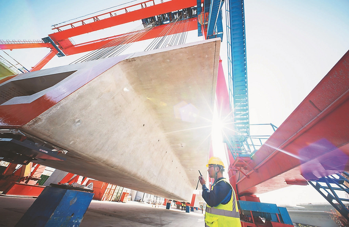 11月28日,位于宿迁市的潍宿高铁站前3标宿迁东制梁场,起重指挥人员正在进行起重指挥作业。潍宿高铁起于山东省潍坊市,终点为江苏省宿迁市,新建线路为398.5公里。 陆启辉 摄 (视觉江苏网供图)