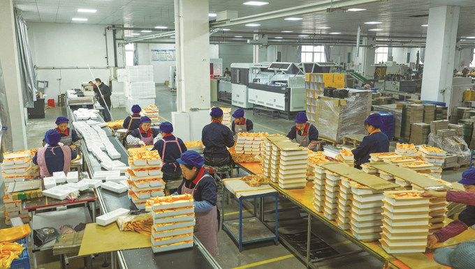 12月11日,泗洪县双沟镇工业园区一包装企业,工人们赶制订单,全力冲刺收官,夺取“全年红”。陈玉 摄