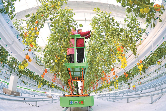 1月6日,泗洪县魏营镇前营社区现代化果蔬大棚内,无土栽培的西红柿换上一袭鲜艳“红妆”。工作人员穿梭于藤蔓间,熟练地修剪侧枝、检查植株长势,为新一年的产销带来了红红火火的“开门红”。 李佳 摄 (视觉江苏网供图)