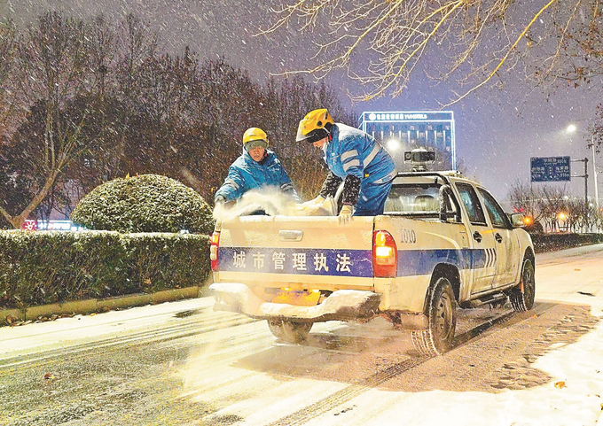 1月19日晚,沭阳县常州路的辅道上,环卫工人分时段进行撒盐除雪,为市民出行提供安全保障。