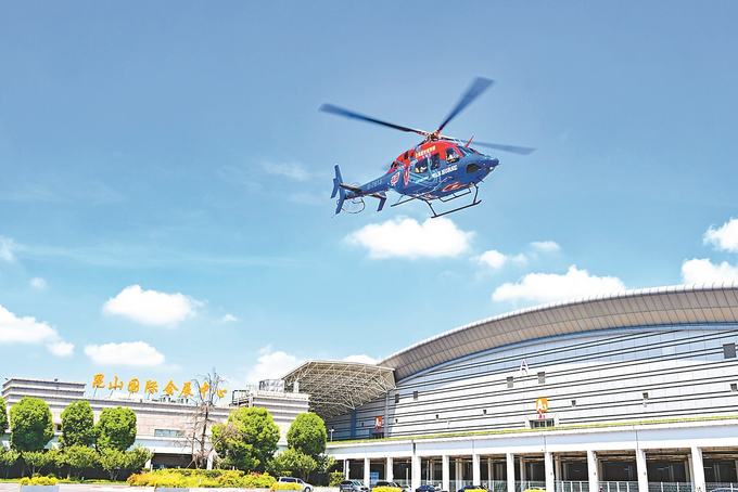 8月18日,在“昆山航站楼—上海浦东机场”航线开通一周年之际,昆山第二条跨省直升机载人航线“昆山航站楼—上海杨浦复兴岛”正式开通,图为该航线首飞直升机从昆山航站楼起飞飞往上海。袁新宇 摄 (视觉江苏网供图)