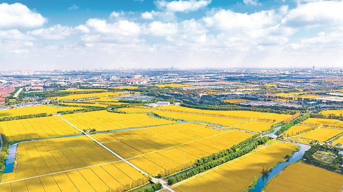 10月10日航拍昆山市淀山湖镇,稻田、湖泊、村舍等构成一幅丰收在望的美好秋日画卷。 袁新宇 摄 (视觉江苏网供图)