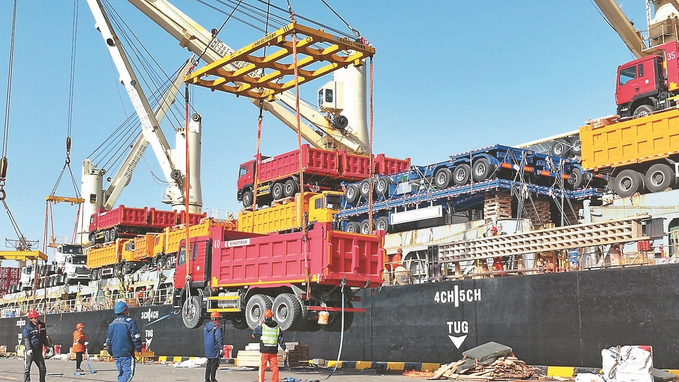 11月28日,张家港港务集团有限公司码头一片忙碌,货轮停在泊位上有序装载385辆“中国制造”工程车,准备驶往“一带一路”共建国家肯尼亚。张家港出入境边防检查站开通快捷通道,助力“中国制造”走出国门。统计数据显示,今年前10个月,张家港对“一带一路”共建国家进出口1348.7亿元,同比增长12.6%。 施柏荣 张边轩 摄 (视觉江苏网供图)