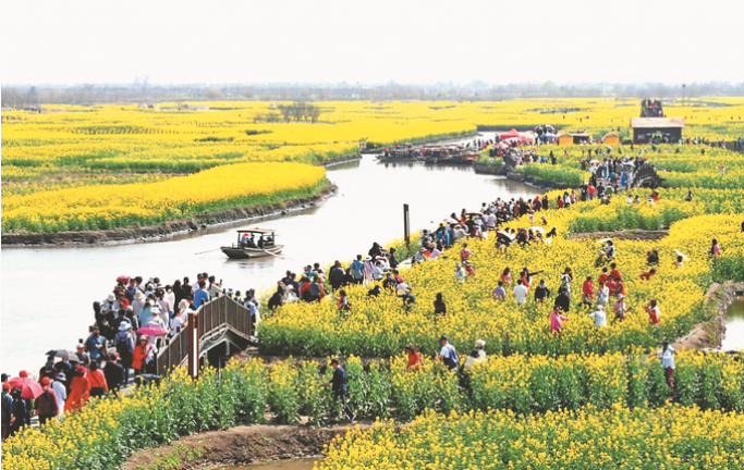 兴化的千垛油菜花进入盛花期。3月25日,这片广袤的田野被金黄的油菜花装点成一幅金色的画卷,吸引众多游客前来感受这让人陶醉的春天气息。吴胜 杨桂宏 摄 (视觉江苏网供图)