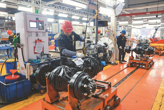 3月16日,靖江市各园区与重点企业忙生产、赶订单,以实干实绩全力冲刺首季“开门红”。图为江苏中力叉车有限公司工人在流水线上进行新能源叉车装配作业。 顾继红 卢钰 摄(视觉江苏网供图)