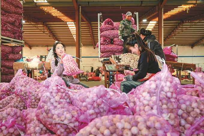 11月21日,“邳州大蒜”成功入选国家地理标志保护示范区公示名单,当地市场监管局通过规范“邳州大蒜”地理标志用标,让生产、经营、消费者的地理标志保护意识不断提高,品牌价值持续攀升。图为11月23日,邳州大蒜龙头企业江苏黎明食品集团有限公司的生产车间内,工人们正加紧对出口东南亚的优质大蒜进行分拣包装。 通讯员 吴咏进 本报记者 张筠 摄 (视觉江苏网供图)