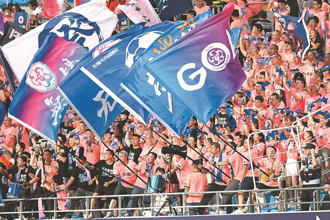10月8日晚,“苏超”淘汰赛盐城VS无锡比赛现场,球迷们在为队员们加油呐喊。本报记者 吴俊 摄