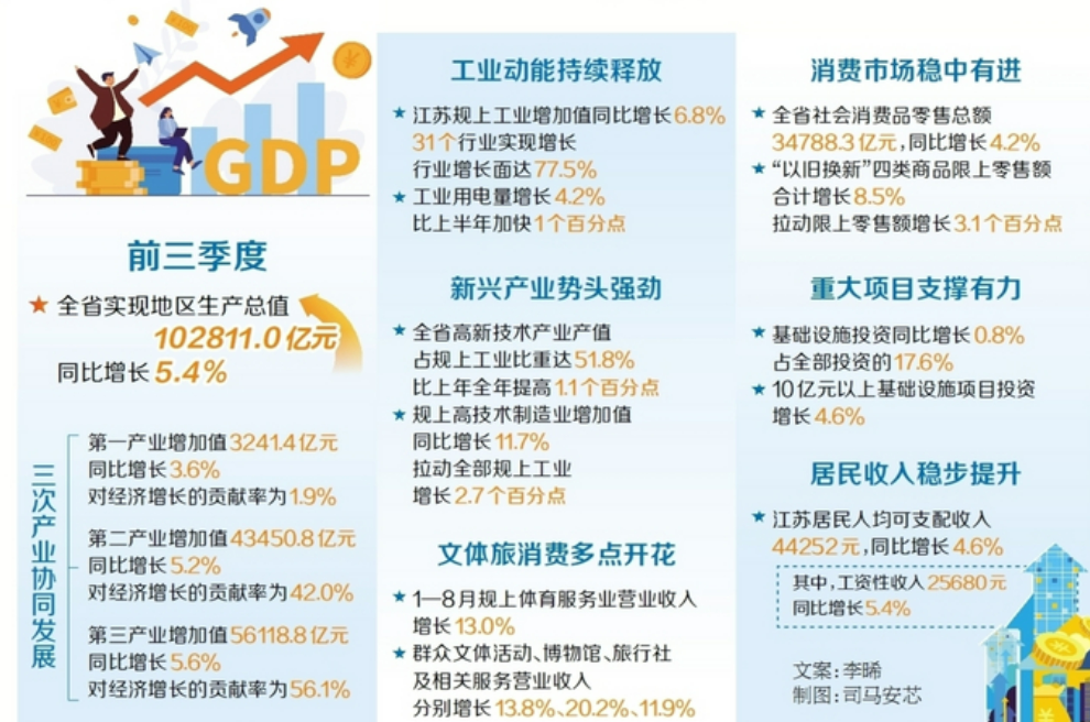 10月25日,省统计局发布我省前三季度经济运行情况,总体来看,全省经济运行总体平稳、稳中有进,呈现出“稳、进、新、韧”的显著特征。根据地区生产总值统一核算结果,前三季度全省实现地区生产总值102811.0亿元,按不变价格计算,同比增长5.4%。其中,第一产业增加值3241.4亿元,同比增长3.6%;第二产业增加值43450.8亿元,增长5.2%;第三产业增加值56118.8亿元,增长5.6%。