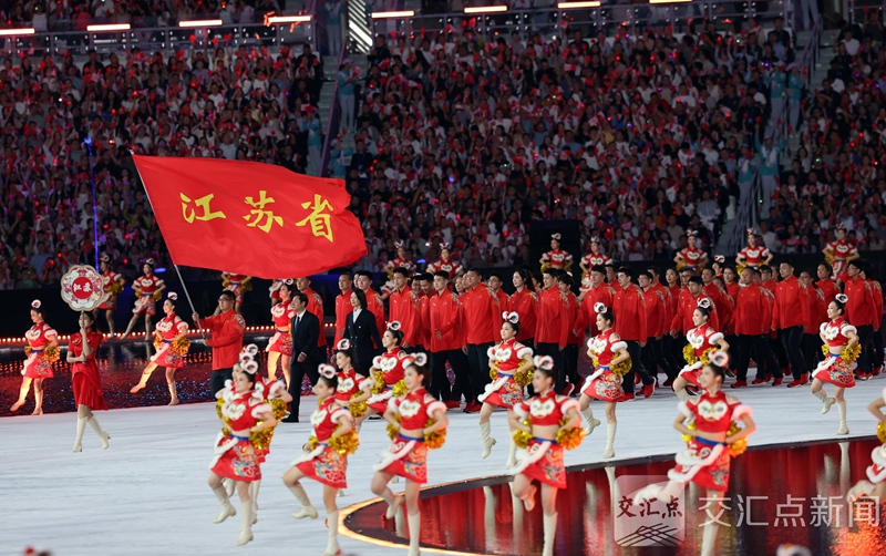 20时12分,在万众瞩目的开幕式入场仪式中,由51名江苏运动员、教练员和工作人员组成的江苏代表团方阵迈着矫健的步伐登场,他们来自跳水、排球、攀岩等多个项目。旗手由亚运会冠军、田径运动员王琦担任,这位来自江苏扬州的青年名将,作为耀眼的“领航者”展现江苏体育人的风采。四年一度的全运会,是国内顶级的综合性体育盛会,也是检验江苏体育强省建设成果的重要赛事。此次江苏代表团由张雨霏、盛李豪、张常宁、龚翔宇等4位奥运冠军领衔1340名健儿出征,首次参加全运会的有554人,占参赛运动员总数的62.9%。882名竞体选手入围31个大项315个小项的决赛,458名群体选手入围21个大项101个小项的决赛,入围决赛人数和小项数均创历史新高,传统项目与新兴项目全面出击,成为江苏体育人才辈出的生动缩影,诠释“全民体育”的深厚底蕴。截至开幕式当天,江苏代表团已在女子手球、蹦床男子团体、男子10米气步枪个人、武术套路男子长拳刀术棍术全能等项目中斩获金牌,并在多个小项中有奖牌入账。